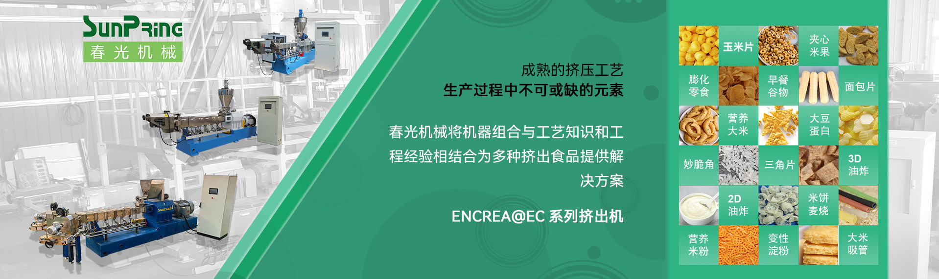 济南春光机械设备有限公司是专业从事双螺杆食品膨化机的新兴企业。我公司汇聚了行业工作十数年的专家队伍,不仅在挤压技术研究方面倾尽全力,更努力在食品工艺方面不断探索,以便客户生产出市场领先食品。